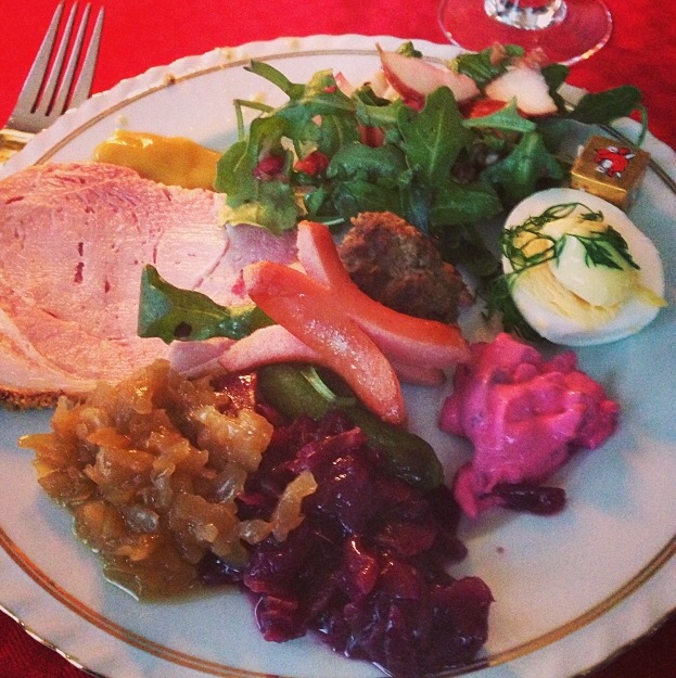 Then there’s napping, family time, lounging around, pretty much whatever you’d like. Late in the afternoon is julbord, Christmas dinner. It’s served as a buffet and I must admit, was a meal of very few things I identify with Christmas, or recognized for that matter. Keeping with the Swedish tradition there was a good amount of fish featured dishes. Being a non fish eater, I passed on all of those. The rest of the buffet included two types of pickled cabbage (red and white), salad, ham, meatballs, tiny hotdog weenies, bread which is meant to be dipped into the pan drippings from the cooked ham (this is why the day is referred to by Swedes as Dopparedagen, or Dipping Day), red beet salad, boiled potatoes, and hard boiled eggs served with mayo, dill, and topped with shrimp. It was certainly a change of cuisine for an American at Christmas!